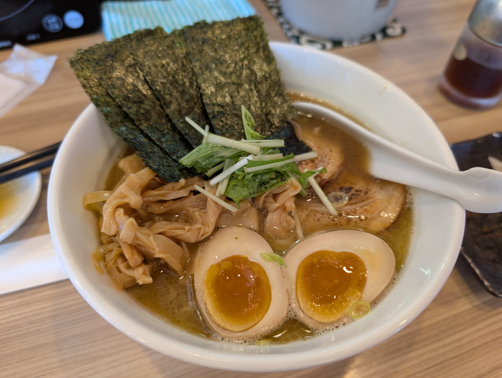 全部乗せラーメンが1,300円です。物価高騰とは言えやっぱり飲食店の値上がりは結構エグいなぁと思いました。感覚的には数年で1.5倍は上がっているような気がします。店を訪れる男性陣はみな会社勤めの雰囲気で、いつも外食しているとお昼代だけで月に2万は下らないなと変な計算をしながらラーメンを食べました。味は普通に美味しかったのですが、次回はまた数年後で良いかな?たまにラーメン屋巡りを趣味にしている人を見聞きしますが、あの情熱はよく分からんなと感じます。